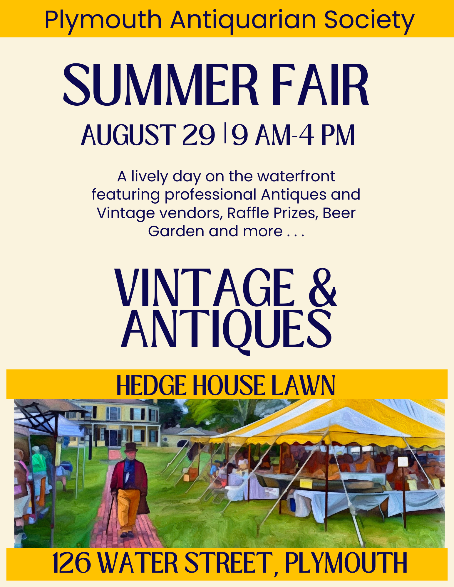 The Plymouth Antiquarian Society’s annual old-fashioned Summer Fair will be held on Saturday, August 29th (same day as the Plymouth Waterfront Festival) from 9 a.m. to 4 p.m. at the historic Hedge House, 126 Water Street, Plymouth. Shop antiques and vintage items from a variety of professional vendors, plus raffles, Hedge House tours, beer garden and live music. It all takes place under a tent on the Hedge House lawn, making this a rain-or-shine event.