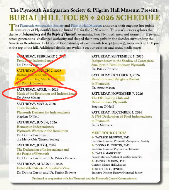 Sadly, Burial Hill remains largely inaccessible, with easily a foot of snow remaining on most paths. With your safety in mind, we must cancel our Saturday, March 7th scheduled tour. The good news is that we are springing ahead this weekend and expecting a warm up. We look forward to seeing you on Saturday, April 4th for Dr. Anne Mason’s Music of the Revolution and Independence tour.